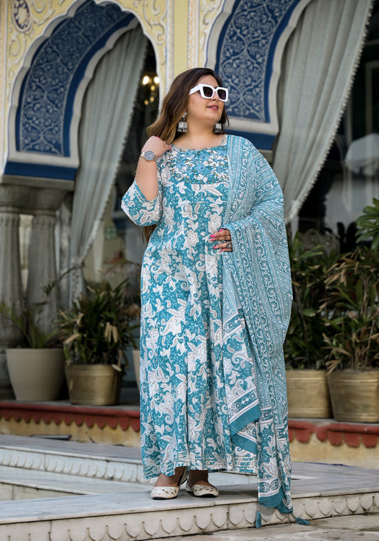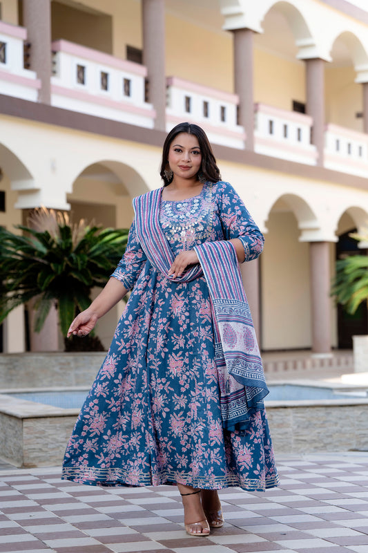 Blue Embroidered Anarkali Kurta & Dupatta Set