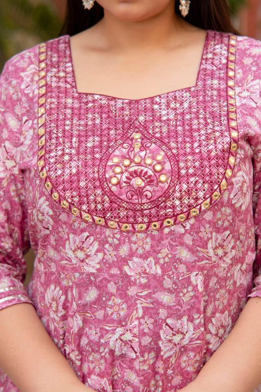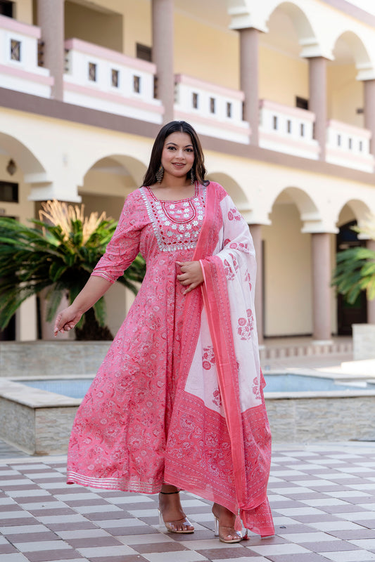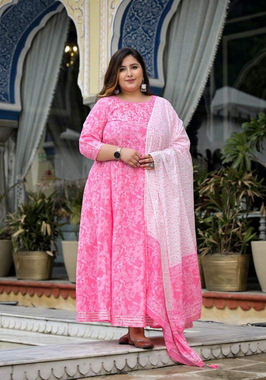 Pink Embroidered Anarkali Kurta & Dupatta Set (Pure Cotton)