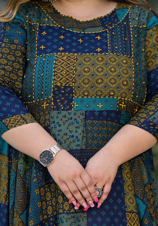 Women Printed Rayon Flared Kurta (Blue)