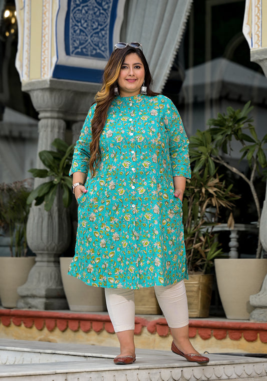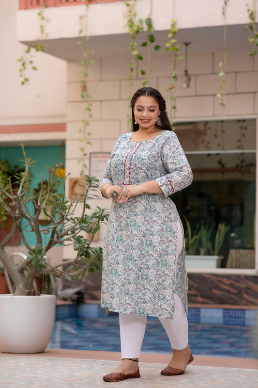 Light Blue Printed Pure Cotton Straight Kurti