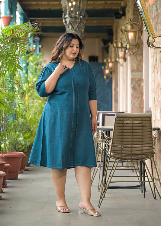 Teal Solid Cotton Midi Dress