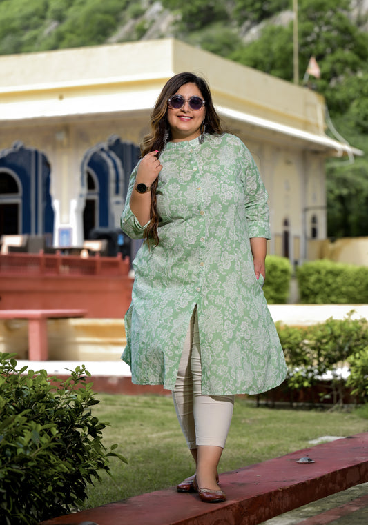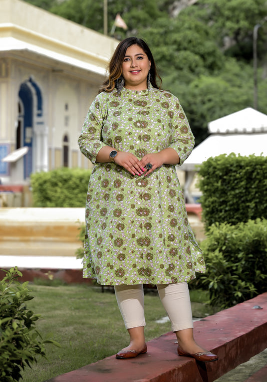 Green Front Slit 'A' Line Kurta (Cotton)