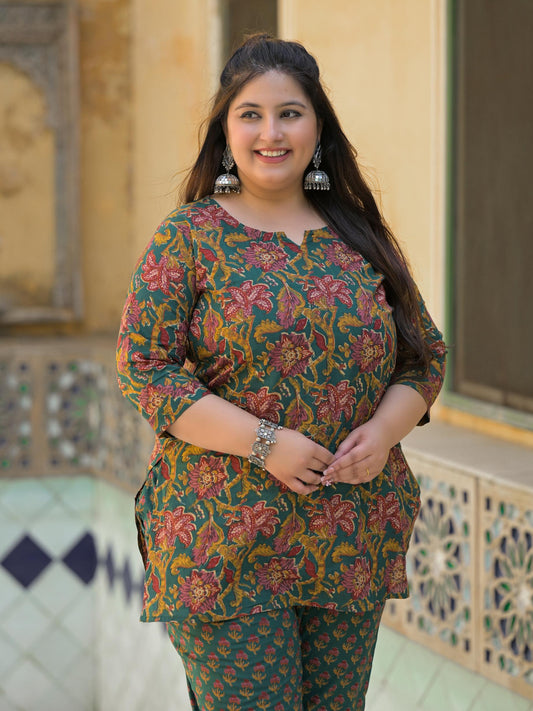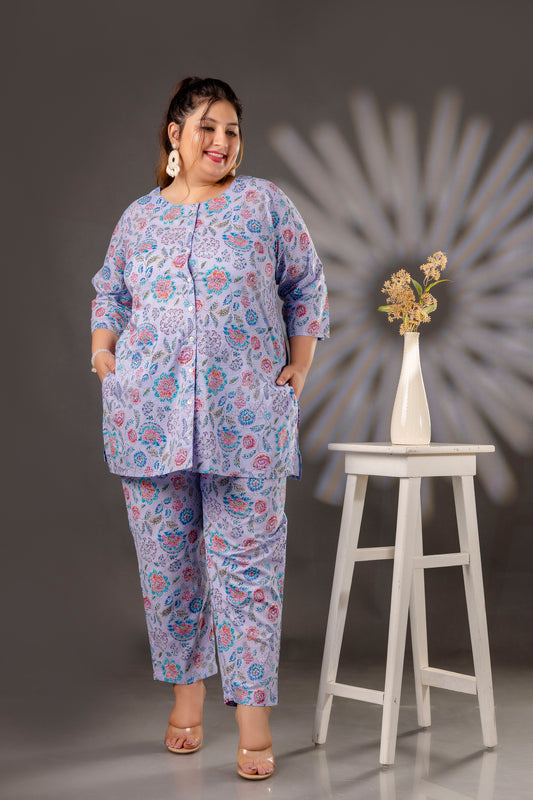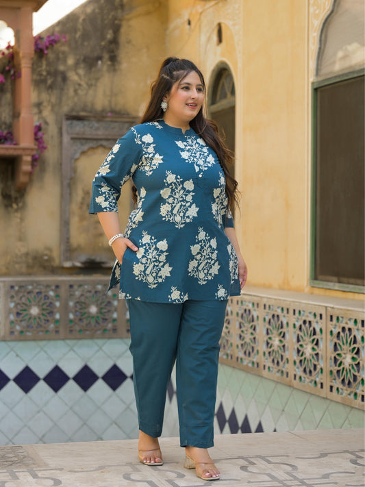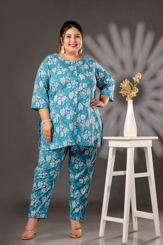 Teal Blue Floral Print Pure Cotton Co-Ord Set