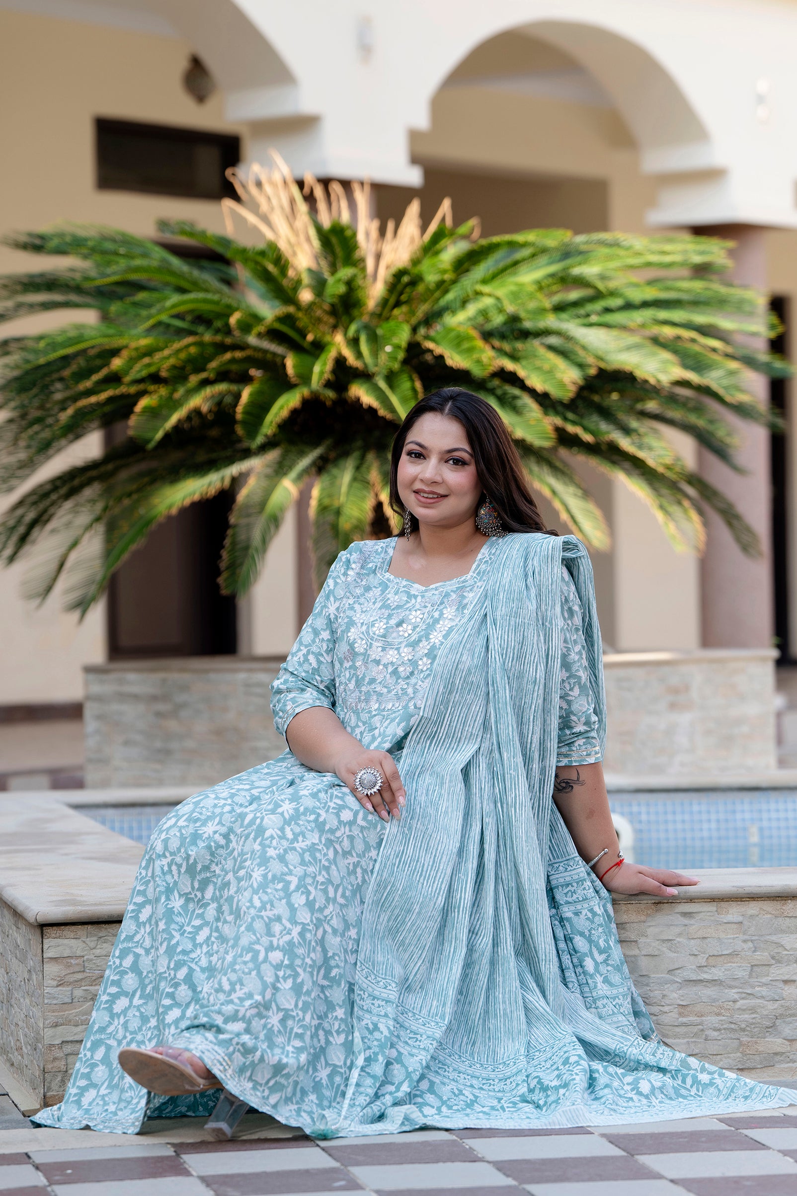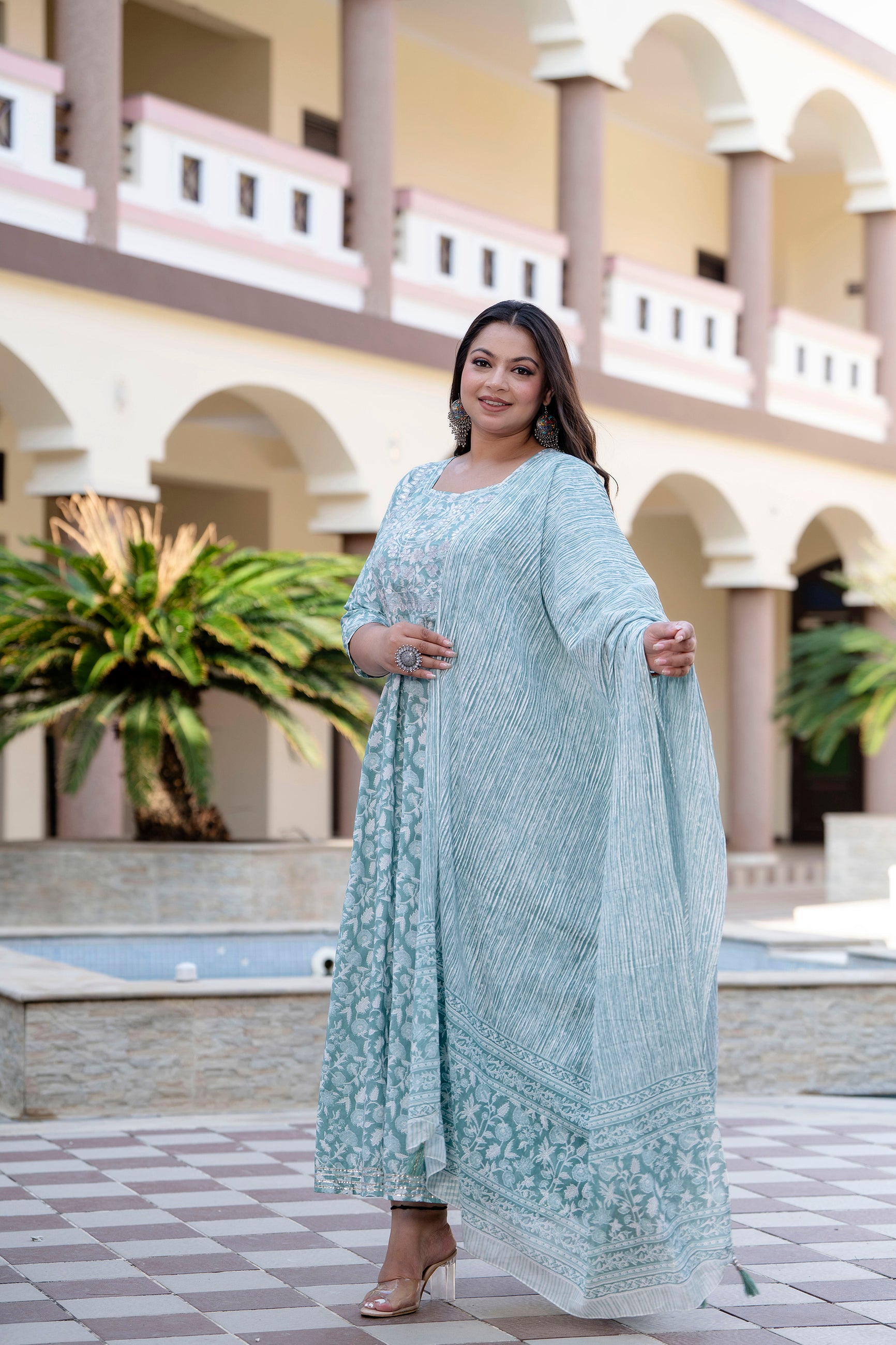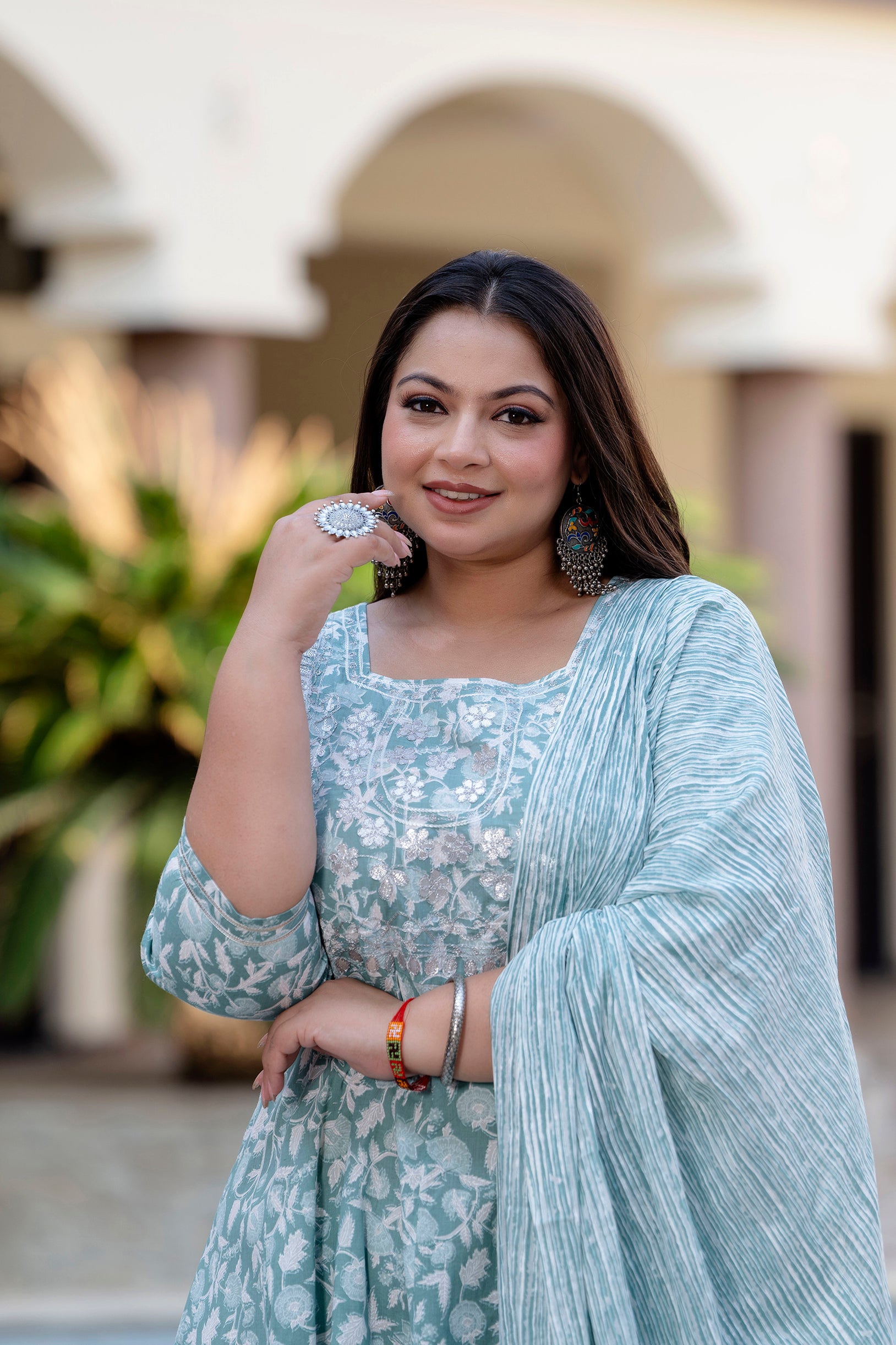 Sky Grey Embroidered Anarkali Kurta & Dupatta Set